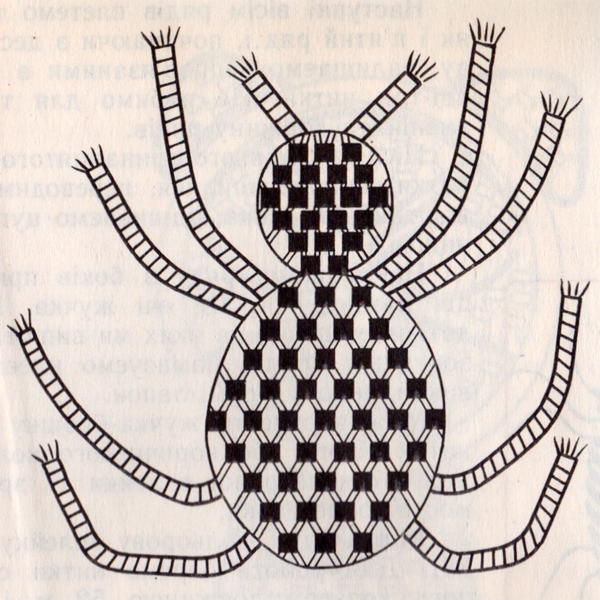 Берем нить длиной 30 сантиметров и сшиваем ее кончики, чтобы получить кольцо. На это кольцо прикрепляем шесть нитей длиной 1м 50см. Плетем ими по схеме. Схема плетения паука в макраме: