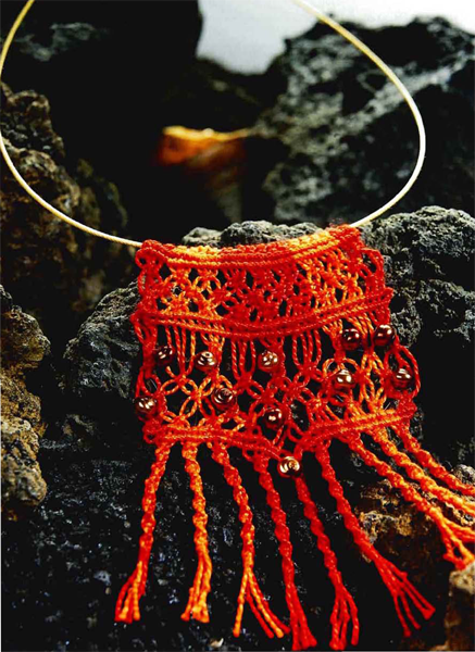 Сплетем еще одно нарядное колье. Оно чем-то напоминает украшение в народном стиле и не требует сложных навыков владения макраме. Вид готового изделия: